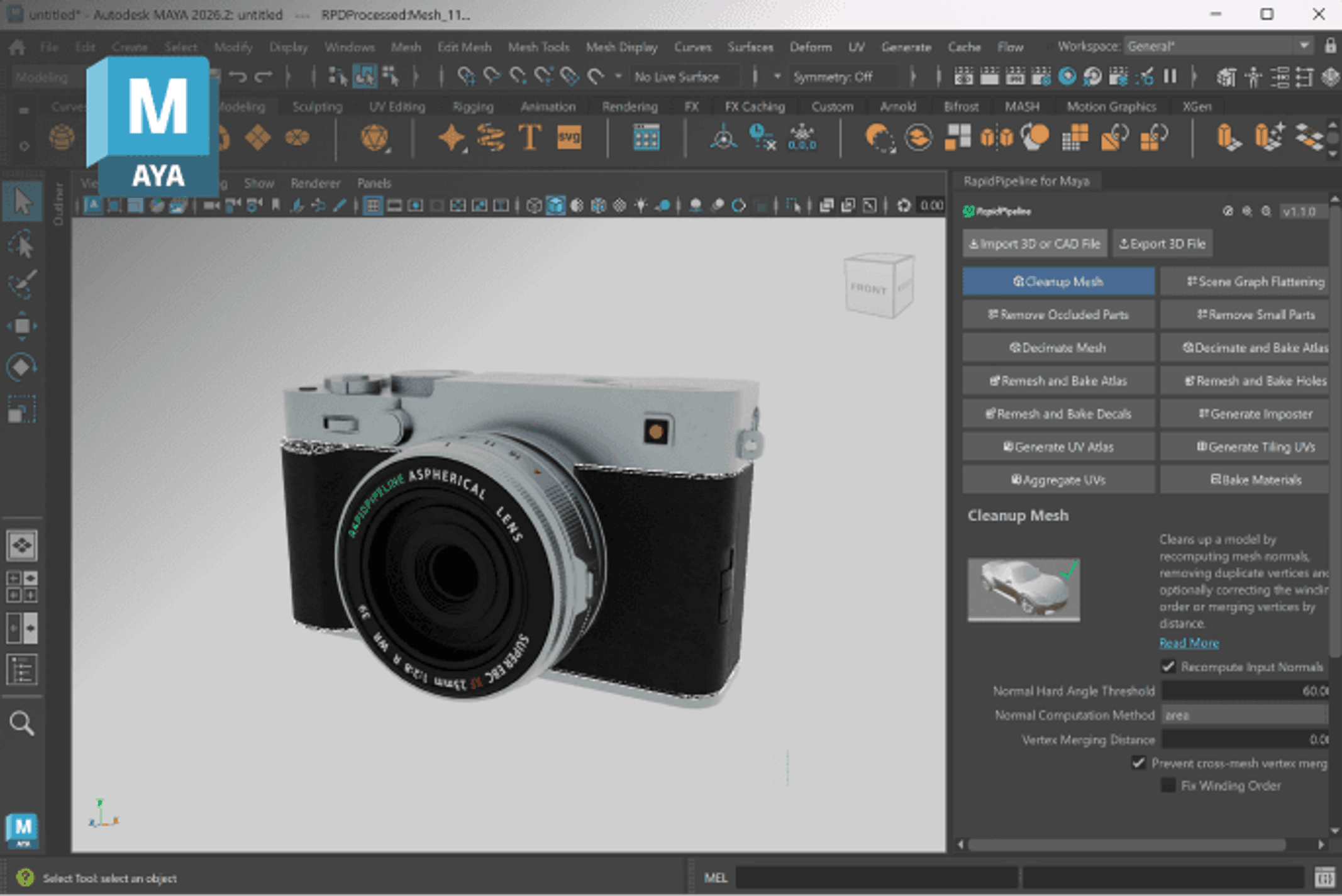 Supercharge Maya with RapidPipeline 3D Processor: seamlessly import CAD and 3D files, simplify geometry, generate UVs, and prepare assets with production-ready efficiency. Run everything locally, right from your Maya interface.