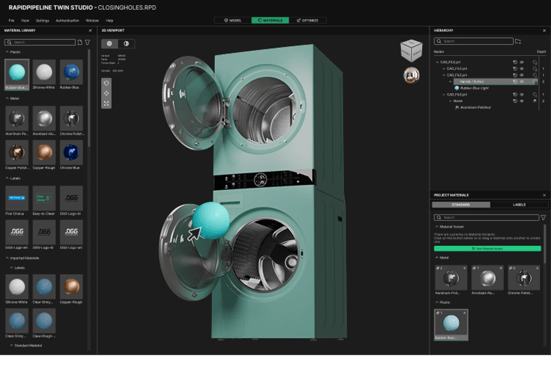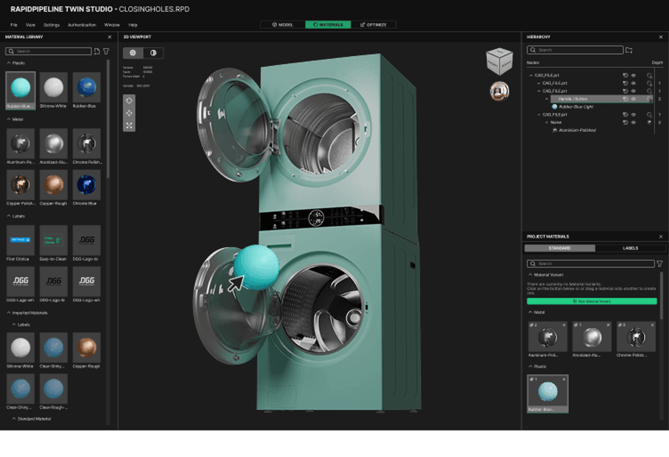 Use our PBR materials library to give your product a realistic finish, and easily place logos, labels, screens, and stickers directly onto your 3D model.